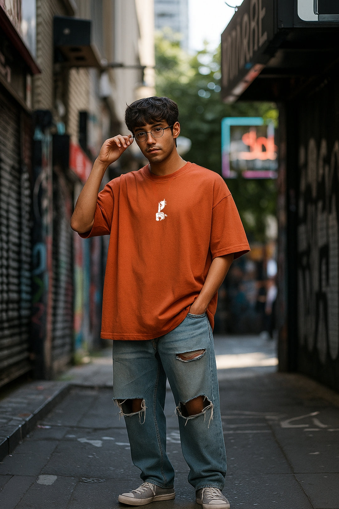 Designed with an oversized fit and vibrant flame-orange color, this T-shirt pairs effortlessly with cargos, denim, or joggers for a laid-back yet powerful look.